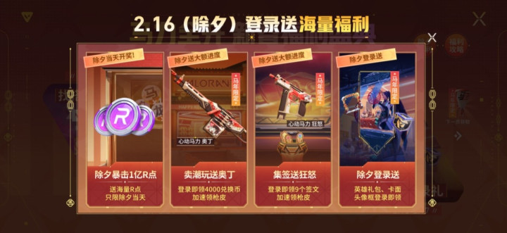 福利体系拆分为五大板块,覆盖登录、活跃、社交、收集、付费等多个维度:更新登录送7日英雄招募加速+R点概率掉落;版本介绍互动送限定卡面;限时免费皮肤体验+奥丁永久皮肤任务;情人节组队活动解锁双人主题道具;生肖扭蛋收集(集齐12枚除夕领20R点);以及最重磅的除夕当晚1亿R点奖池抽奖。